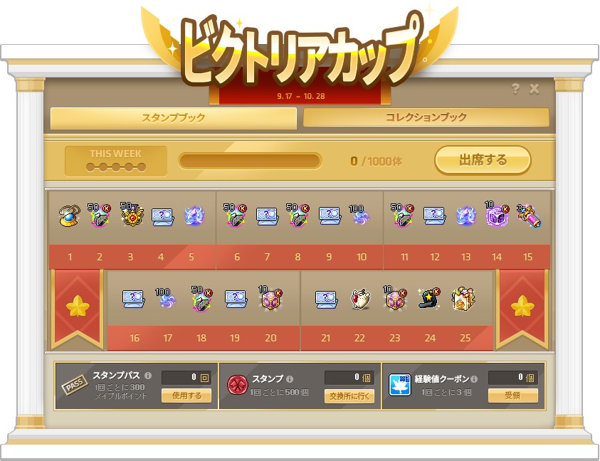 イベント期間中に開催される全3種類のミニゲームに参加すると、「コレクションポイント」を獲得することができる。コレクションポイントを集めて出席を完了するたびに、「バッジ」などの報酬が獲得できる。また、「コレクションブック」で30回出席すると、限定アバターや椅子などがセットになった「ビクトリアカップコレクションコンプリートボックス」もプレゼントする。