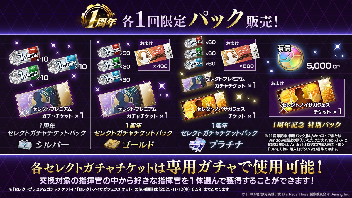 2025年10月1日(水)より、1周年を記念したセレクトガチャチケットパック4種を実施する。