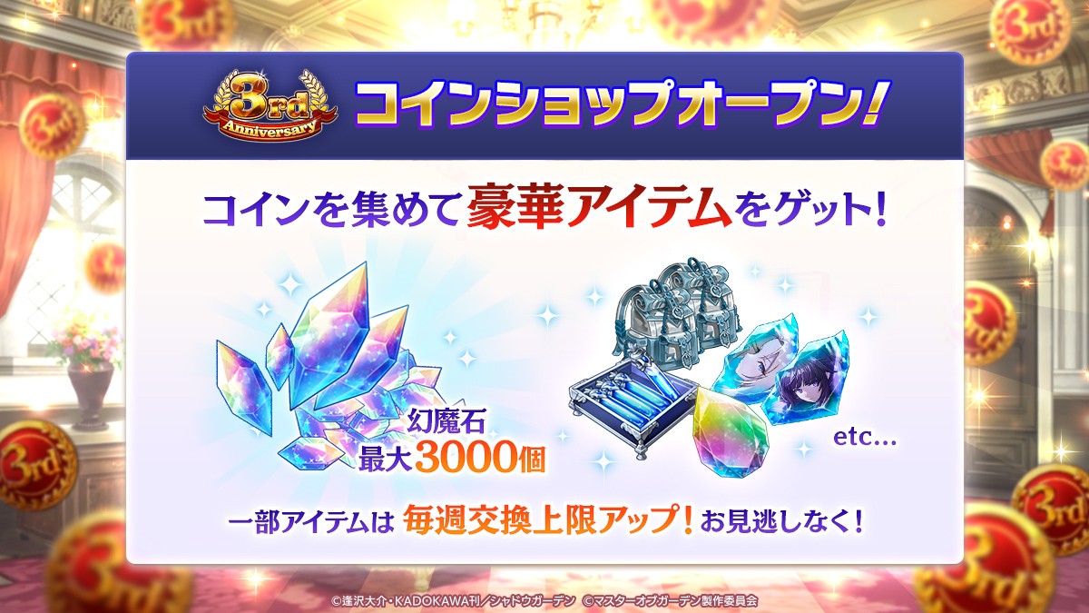 期間中ミッションに挑戦し、3rd Anniversaryコインを集めると、幻魔石最大3,000個や濃縮魔力液、キャラのカケラなど豪華報酬を獲得することができる。